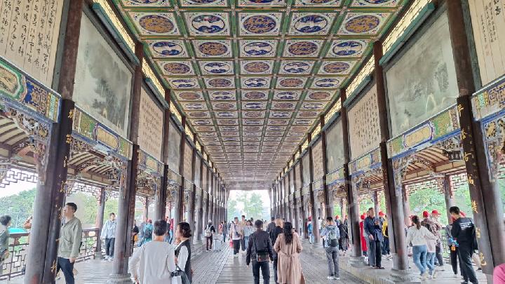 Pathway to the temple complex displaying wooden columns and ornamental ceilings, another part of the Dujiangyan irrigation system, Sichuan Province, China, 19 October 2025. Tempo/RR Ariyani