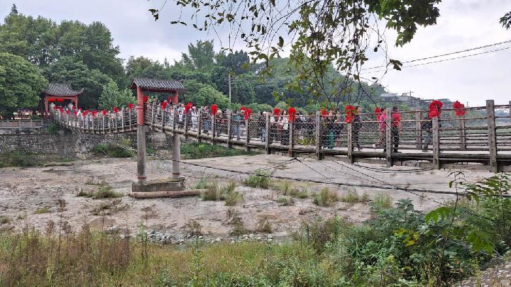 Tourists walking on the suspension bridge in the Dujiangyan irrigation system complex, Chengdu, Sichuan Province, China, 19 October 2025. Tempo/RR Ariyani
