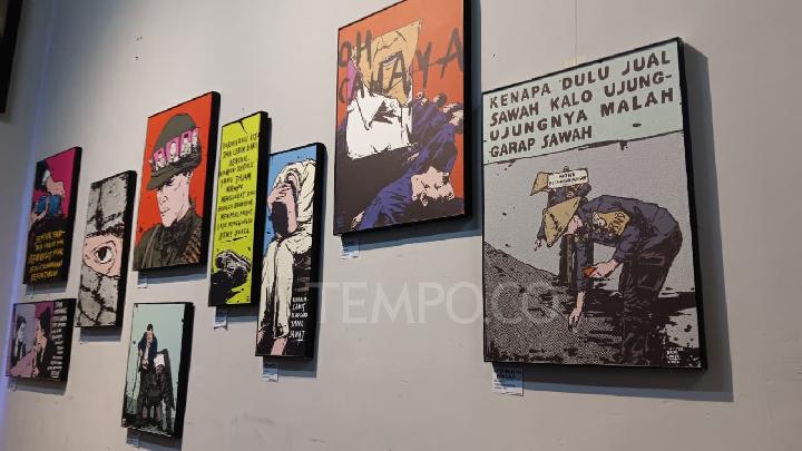 Pameran tunggal ilustrator Palembang Yudistira Wiranata berjudul "Eksibisi di Toko Fotokopi" pada Senin, 14 April 2026. Beberapa karyanya menyoroti soal isu-isu sosial dan lingkungan. TEMPO/Yuni Rahmawati