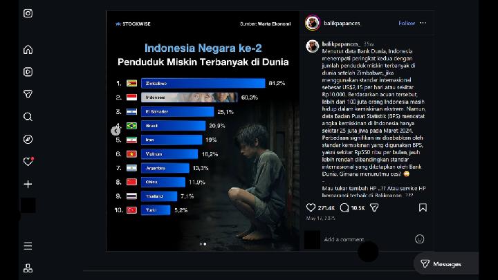 TEMPO.CO, Jakarta - An infographic showing Indonesia is the second-poorest nation globally has been widely circulated on social media platforms, including Instagram [archive], Threads, and Facebook. The post claims to cite official data from the World Bank.