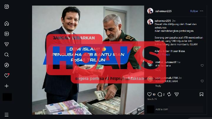 TEMPO.CO, Jakarta - Four photos claiming that a businessman from West Sumatra, M. Hasbi Al-Khairi, donated trillions of rupiah to Iran have been circulating on social media since late March 2026. The posts spread across Instagram [archive], Facebook, Threads, TikTok, and YouTube.