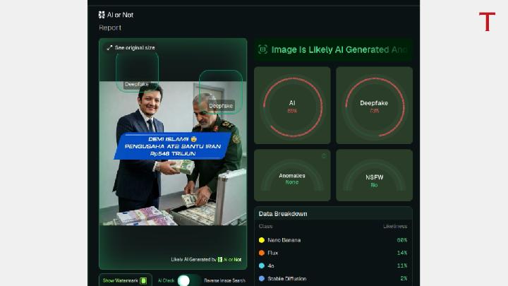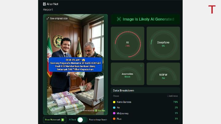 Tempo verified the content through reverse image searches, keyword tracing, manual analysis, and AI detection tools. The result: the images are products of artificial generation. The name M. Hasbi Al-Khairi is also not found in any list of Indonesian businessmen.