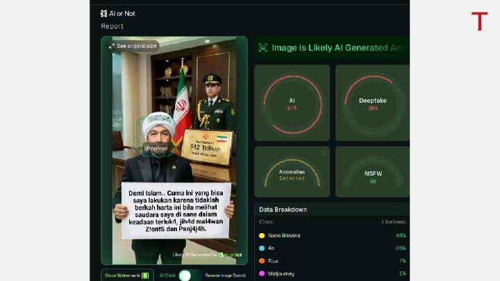 Tempo’s verification concludes that the claim of a Rp500 trillion donation by an Indonesian businessman to Iran is false. The photos presented as supporting evidence are also AI-generated.