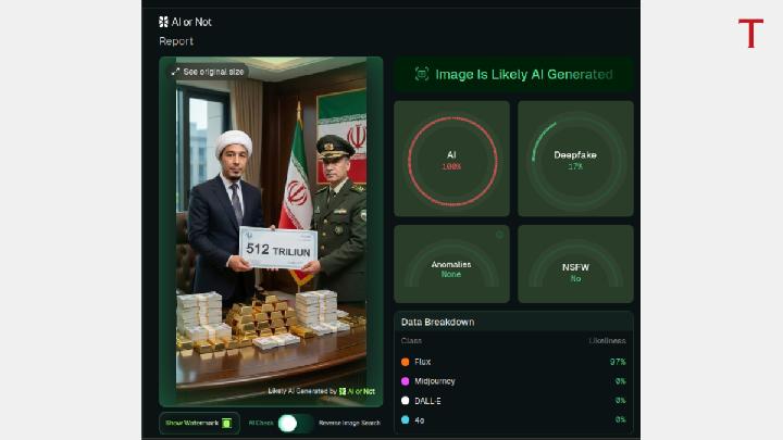 The second photo features the logo of Iran’s Islamic Revolutionary Guard Corps (IRGC), but it deviates from the original version as seen on Iranintl.com. AI or Not detected 74 percent AI-generated elements, while Was It AI concluded with high confidence that the image is not authentic.