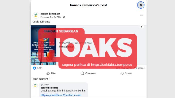 TEMPO.CO, Jakarta - A Facebook account named "Bansos Kemensos" [archive] spread the claim that KTPs (ID cards) contain Rp2.5 million in aid for February and March 2026.