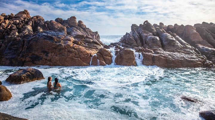 Tak jauh dari kawasan Margaret River, Injidup Beach menyuguhkan panorama yang lebih “liar”. Ombak besar menghantam tebing batu, menciptakan pemandangan dramatis yang memikat. Salah satu spot ikoniknya adalah Injidup Natural Spa, kolam alami di antara batu karang yang terisi air laut saat ombak datang, menciptakan sensasi layaknya spa alami.
