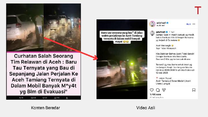 TEMPO.CO, Jakarta - A number of posts containing claims about the presence of many dead bodies inside cars in Aceh Tamiang Regency, Aceh, circulated on TikTok [archive], X [archive], and Facebook on December 7, 2025.